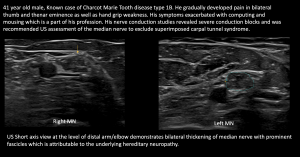 Fig 10: CHARCOT MARIE TOOTH DISEASE WITH SUPERIMPOSED COMPRESSION AT TWO SITES (DOUBLE CRUSH SYNDROME) Nerve thickening due to underlying hereditary neuropathy