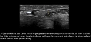 Fig 15: POST CTR SURGERY PALMAR CUTANEOUS BRANCH (PCB) NEUROMA AND FCR TENOSYNOVITIS Normal Median Nerve at Carpal tunnel; Persistent PCB neuroma
