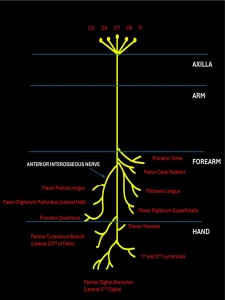 Motor branches to the pronator teres, palmaris longus, Flexor Digitorum Superficialis (FDS), and Flexor Carpi Radialis (FCR) arise from the main trunk at the level of the elbow and proximal forearm. The Anterior Interosseous Nerve (AIN) is a purely motor branch that originates at the level of the pronator teres. It runs superficial to the interosseous membrane along the anterior interosseous artery and supplies the radial half of Flexor Digitorum Profundus (FDP), Flexor Pollicis longus (FPL), and pronator quadratus. The palmar cutaneous branch (PCB)arises a few centimetres proximal to the wrist crease and is a sensory branch to the thenar area. It is classically spared in carpal tunnel syndrome due to its proximal origin [1].