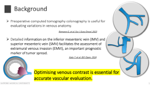 High-quality visualization of the mesenteric veins, particularly the inferior mesenteric vein (IMV) and superior mesenteric vein (SMV), is clinically valuable for precise preoperative vascular mapping and for assessing extramural venous invasion (EMVI) in colon cancer, an important prognostic indicator of tumor spread [1–3]. Accurate evaluation of these factors contributes to optimal surgical planning and reduces the risk of unexpected vascular injury [4,5].