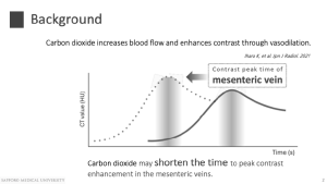 Carbon dioxide (CO₂) insufflation is routinely used in contrast-enhanced CT colonography to ensure sufficient colonic distension. Recent studies suggest that, beyond luminal expansion, CO₂ may exert vasodilatory and microcirculatory effects [6,7]. This study investigates the effect of CO₂ insufflation during CT colonography on the peak arrival time of mesenteric venous enhancement, with a particular focus on the IMV and SMV.
