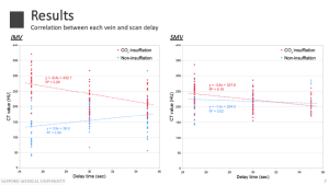 These findings indicate that CO₂ insufflation is associated with a steeper and earlier enhancement curve, whereas absence of CO₂ results in delayed venous opacification.