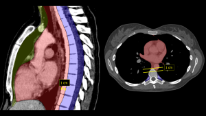 Fig 1: CT Visualization of Mediastinal Compartments (Based on ITMIG 2017 classification [1]). Sagittal overlay (Left) delineates the three distinct zones: Prevascular (yellow), Visceral (red), and Paravertebral (blue). Axial view (Right) demonstrates the Visceral (red) and Paravertebral (blue) compartments. Note that the prevascular compartment is not visible at this specific anatomical level.