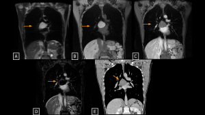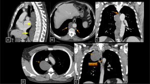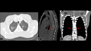 - Imaging: Elongated, vertically oriented paravertebral mass spanning multiple vertebral levels. Characteristic “scimitar” configuration. Tends to partially encase vessels without luminal narrowing, unlike bulky PNSTs.