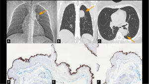 Chest radiograph (A) demonstrates a left paravertebral opacity. Coronal (B) and axial (C) CT images show a well-defined cystic extrapulmonary lesion centered in the left posterior mediastinum, in contact with the aorta and adjacent vertebral bodies at the level of the 5th and 6th costal arches, without evidence of invasion. Histopathological analysis with immunohistochemistry (D, E, and F) demonstrates positivity for estrogen receptor, progesterone receptor, and PAX-8, respectively, confirming the diagnosis of a mediastinal Müllerian cyst.