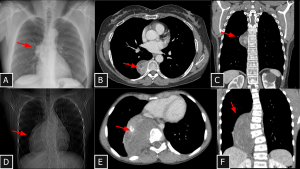 Fig 7: Cases 6 and 7 – Neurogenic tumors of the mediastinum (Case 6: A, B, and C and Case 7: D, E, and F): Chest radiographs show right paravertebral masses (A and D). Both lesions demonstrate heterogeneous attenuation (see C and F), one with hypoattenuating foci—likely cystic components (arrow in B)—and the other with calcified foci (arrow in E). Bone remodeling is also observed as an associated finding. Biopsies confirmed schwannoma and ganglioneuroma, respectively.