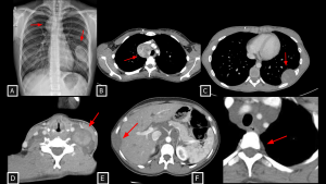 A 21-year-old patient with a history of neurofibromatosis type 1 undergoing evaluation for cough and constitutional symptoms. Chest radiograph (A) showed mediastinal widening and a left pulmonary mass. Corresponding to the radiographic findings, contrast-enhanced chest CT (B and C) demonstrated two heterogeneous expansile lesions located in the visceral mediastinum and left thoracic wall, containing hypoattenuating foci (likely cystic components). Biopsy of the right paratracheal lesion revealed a malignant peripheral nerve sheath tumor.