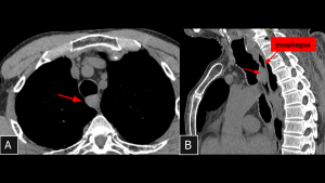 Panels A and B depict a homogeneous solid nodule located anterior to the esophageal wall (visceral mediastinum) (arrows in A and B), consistent with an esophageal leiomyoma previously identified on upper endoscopy.