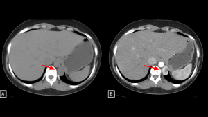 Unenhanced CT (A) reveals a paravertebral mass extending from the retroperitoneum into the thorax. The intense arterial enhancement seen in Panel B is the key diagnostic feature, confirming the tumor's hypervascular nature and distinguishing it from other neurogenic lesions.