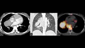 Axial CT (A) reveals a right hilar mass with extension to the ipsilateral posterior mediastinum. Coronal view (B) demonstrates the anatomical relationship with the bronchi. The lesion showed uptake on 18 FDG PET CT (C) but remained stable over a 3-year period, consistent with this benign lymphoproliferative disorder.