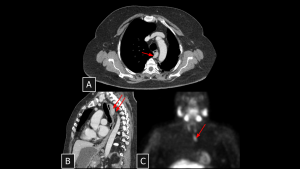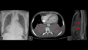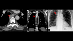 An asymptomatic patient undergoing staging for colon neoplasia demonstrated, on chest computed tomography, an extensive elongated hypoattenuating, non-enhancing formation within the visceral mediastinum (A), communicating with small dilatations of the lumbar lymphatic ducts (arrows in B), consistent with a thoracic duct lymphocele. The lesion was secondary to an obstructive lipoma located in an anterior paravertebral position at the level of the aortic arch (arrow in C).