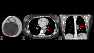 A 35-year-old patient with an atypical lipomatous tumor of the right leg (previously operated, with local recurrence demonstrated on MRI (A) developed a heterogeneous solid lesion in the paravertebral mediastinum (arrow in B). The lesion was located anterior and left to the thoracic vertebral bodies and contained foci of fat attenuation (arrows in B and C), consistent with secondary involvement.