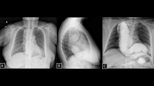 Posteroanterior (A) and lateral (B) chest radiographs of a female patient with Chagas disease show mediastinal widening, anterior displacement of the trachea, and an elongated retrocardiac opacity. A barium oral contrast esophagogram (C) demonstrated a dolichomegaesophagus mimicking a mediastinal mass.
