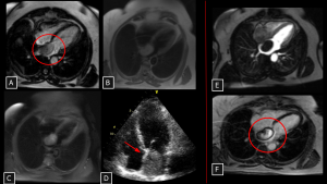 Cardiac MRI (A, B, C, E, F) reveals a lobulated mass in the left atrium. Note the high signal intensity on bright-blood sequences (circle in A) due to the mucinous/water-rich content, which can mimic a cyst. However, the lesion presents heterogeneous enhancement (circle in F), confirming it is a solid neoplasm and ruling out avascular thrombus. Echocardiogram (D) demonstrates the classic pedunculated attachment to the interatrial septum/fossa ovalis (arrow).
