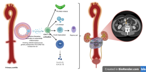 - Idiopathic retroperitoneal fibrosis is thought to be a multifactorial, immune-mediated disorder, most likely representing a manifestation of systemic autoimmune disease originating as primary aortitis. A cytokine-driven inflammatory cascade involving CD4+ T cells, IL-6, Th2 cytokines and TGF-β promotes B-cell maturation and IgG4-producing plasma cell expansion, leading to fibrosis. Genetic susceptibility appears limited, whereas smoking and asbestos exposure are recognised environmental risk factors.