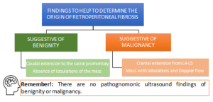 RPF is visualized as a hypo or anechoic, irregular demarcated retroperitoneal mass, anterior to the lower lumbar spine or the promontory of the sacrum.
