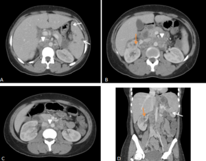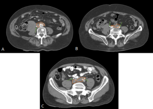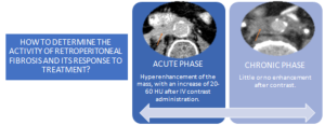 RPF typically appears as a well-defined, irregular paraspinal soft-tissue mass, isodense to the psoas muscle and without lateral extension beyond it. Most often centred at L4–L5 near the aortic bifurcation, it may extend cranially towards the renal hila or, less commonly, caudally to involve pelvic structures. Baseline Hounsfield units (HU) values and the diameter of the retroperitoneal tissue can assist in assessing inflammatory activity. [1,3,5-8]