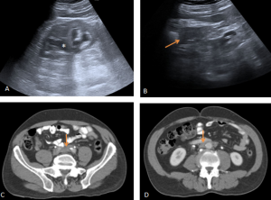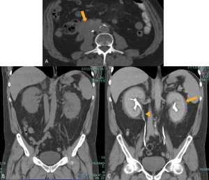 Although both ECD and retroperitoneal fibrosis can lead to hydronephrosis, their distribution differs: ECD typically affects the perinephric fat and renal hila, whereas idiopathic RPF encases the anterolateral aorta and proximal ureters. Aortic encasement (“floating aorta sign”) and periureteric involvement may occur, but ECD usually spares the IVC and pelvic ureters. Additional distinguishing features include irregular perirenal infiltration and bilateral symmetric adrenal thickening.