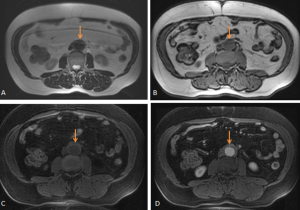 RPF is typically hypointense on T1-weighted images with variable intensity on T2-weighted images as well as in apparent diffusion coefficient values depending on the degree of active inflammation [2,3].