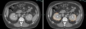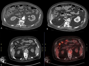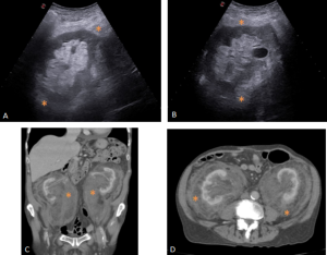 Retroperitoneal and renal involvement occurs in a significant proportion, with CT and MRI demonstrating bilateral perinephric and posterior pararenal soft-tissue infiltration, producing the classic “hairy kidney” appearance. Infiltrates are generally isoattenuating or iso- to hypointense to skeletal muscle with mild contrast enhancement; FDG uptake may be present but can be obscured by physiological renal activity. Chronic infiltration may result in renal atrophy.