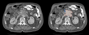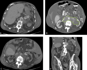 - A cuff of soft tissue along with a desmoplastic response, similar to retroperitoneal fibrosis.