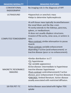 Although enhancement may be present in both malignant and idiopathic retroperitoneal fibrosis, a hypointense T2 signal is far more suggestive of chronic or inactive idiopathic RPF. Differentiation on FDG-PET/CT can also be challenging; however, malignant aetiologies typically demonstrate higher FDG avidity and greater SUVmax values. In comparative studies, lymphoma and metastatic disease showed substantially higher metabolic activity than idiopathic RPF, and were more frequently associated with lymphadenopathy at distant nodal stations [3].