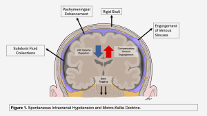 Spontaneous intracranial hypotension is a condition of CSF volume loss. This fits the Monro-Kellie hypothesis: in a closed system, CSF loss is balanced by an increase in the venous compartment. This process leads to classic brain MRI findings: venous engorgement, pachymeningeal enhancement, pituitary hyperemia, and subdural fluid collections.